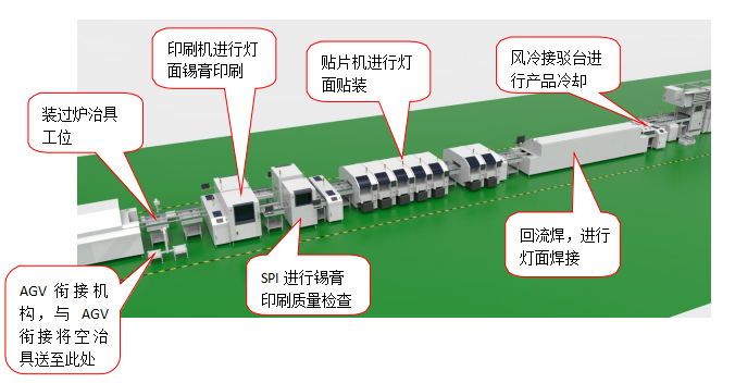 1) 線體將 SMT 工段與裝配段直接對接,產(chǎn)品無需周轉(zhuǎn),減少人工接觸,提升產(chǎn)品品質(zhì),實(shí)現(xiàn)從原料投產(chǎn)到成品出產(chǎn);